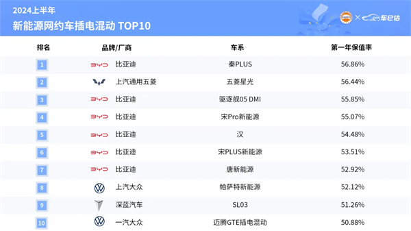 新能源網約車插電混動領域,比亞迪取得斷層式的優勢,共有六款車型上榜,保值率維持在52.92%-56.86%之間。其余上榜車型有五菱星光、大眾帕薩特新能源、深藍SL03、大眾邁騰GTE插電混動,保值率在50%左右。
