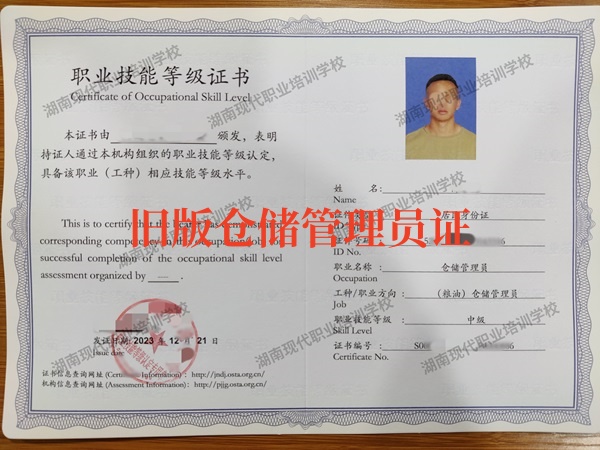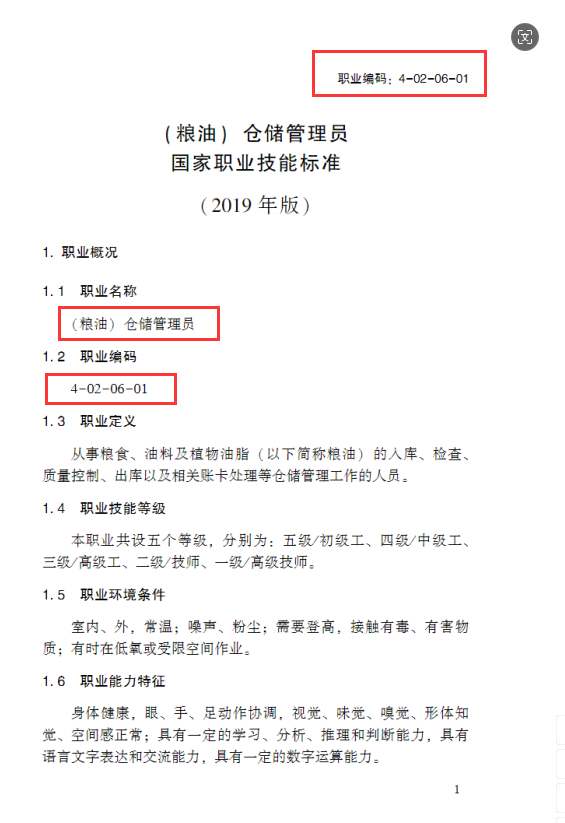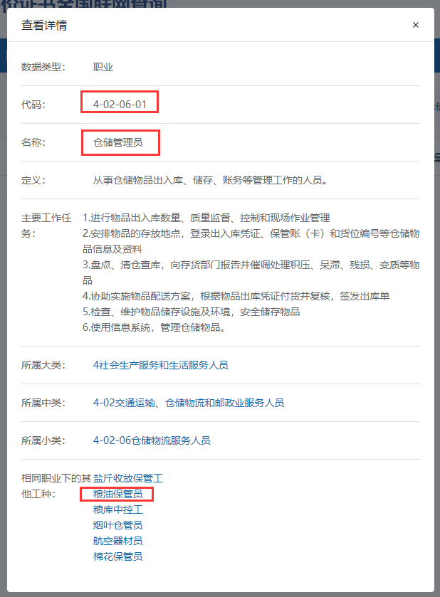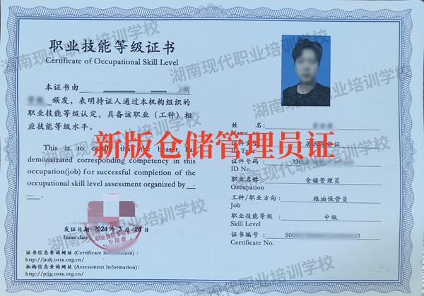 2019年人力資源社會保障部建立完善新職業信息發布制度,實施職業分類動態調整,根據《中華人民共和國職業分類大典(2022年版)》,原職業名稱:“倉儲管理員-(糧油)倉儲管理員”已在部分省份人社廳系統內調整為“倉儲管理員-糧油保管員”,職業代碼均為4-02-06-01,職業標準不變,職業名稱以職業分類體系為準,證書效力一致,落實相關政策兌現相關待遇。