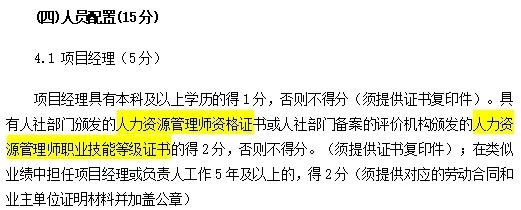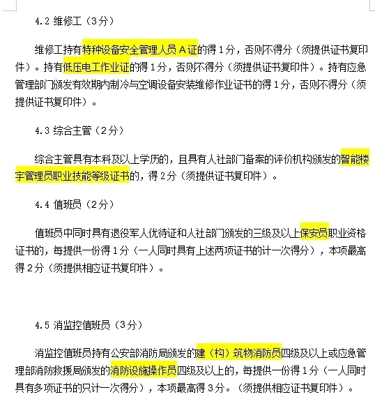 (4)原招標文件第五章 評標方法與評標標準 (分包一) (四)人員配置(15分):“4.3綜合主管(2分) 綜合主管具有本科及以上學歷的,且具有人社部門備案的評價機構頒發的智能樓宇管理員職業技能等級證書的,得2分(須提供證書復印件)。”