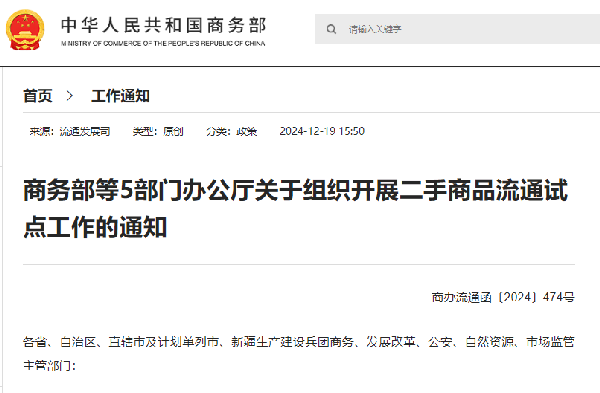 發展二手商品流通,對盤活社會閑置資源,滿足人民群眾差異化、多樣化、個性化消費需求,推動形成綠色生產生活方式具有重要意義。為推動二手商品流通行業高質量發展,擬開展二手商品流通試點工作,現印發《二手商品流通試點工作方案》,請各地認真梳理本地區二手商品流通行業基礎和發展現狀,由省級商務主管部門會同有關部門,組織做好試點城市與試點企業申報工作,并于2025年1月24日前將試點工作實施方案報商務部。