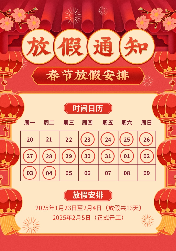 汽車網校假期延長,快樂加倍。放假時間為1月23日-2月4日(共13天),2月5日(農歷正月初八)正式上班。