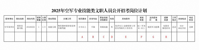 根據《2025年空軍專業技能類文職人員公開招考公告》,空軍今年計劃招考專業技能類文職人員1337名,報名時間為2025年7月10日8:00至2025年7月26日18:00。招考崗位有保管員、司機、炊事員、文印員、汽車修理工兼司機等專業技能三級以下崗位,工作地點分布在北京、廣州、南京、成都、哈爾濱等全國25個省(自治區、直轄市)的66個地級以上城市。為幫助廣大考生高效完成報名、順利通過資格審核,現發布《2025年空軍專業技能類文職人員公開招考報考指南》,就選擇報考崗位、填報個人信息、提交證明材料等網上報名和資格審核有關事項進一步說明如下: