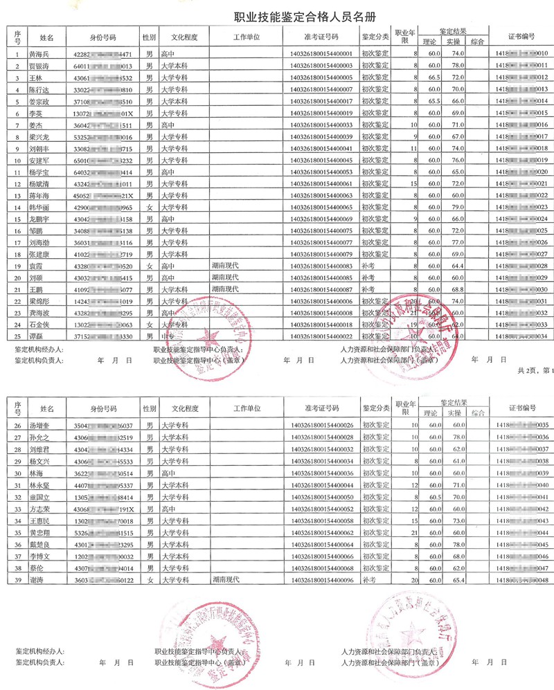 此證書蓋有‘中華人民共和國人力資源和社會保障 部’和 ‘湖南省人力資源和社會保障廳’的職業技能鑒定專用章。可根據中華人民共和國人力資源和社會保障部的官方網站上更新數據的時間進行查詢,下發后60個工作 日左右,可在湖南省人力資源與社會保障服務網可以在線查詢。請各位學員認準真偽!