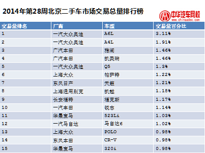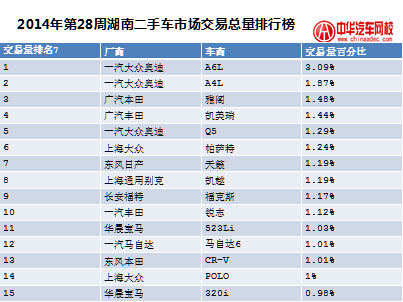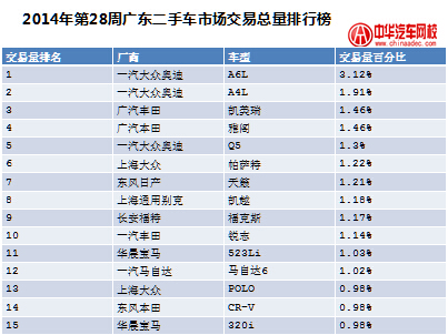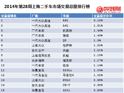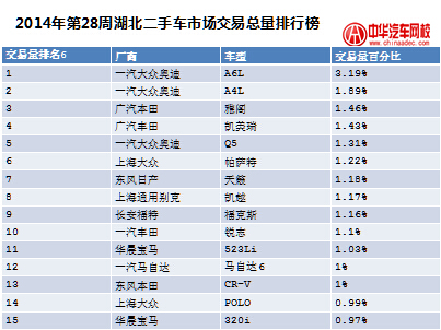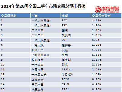 中華汽車網校為大家整理了2014年第28周全國以及部分省市二手車交易量排行榜,包括了廠商、主要車型和所占百分比。
