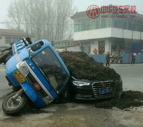 一輛運糞的農用車側翻裝上了一輛奧迪,洗車費比修車費多的節奏