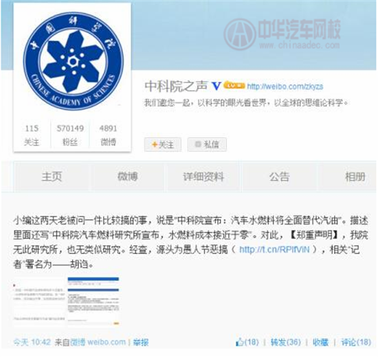 中科院:“汽車水燃料將全面替代汽油”純屬愚人節謠言