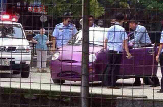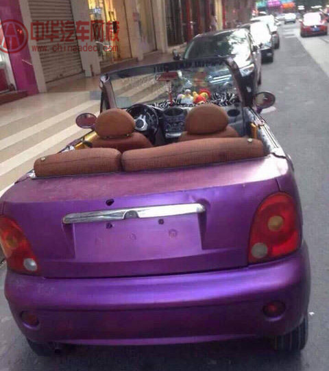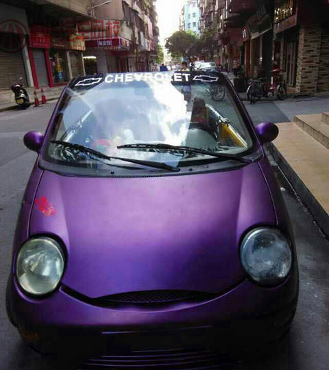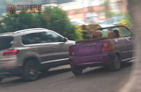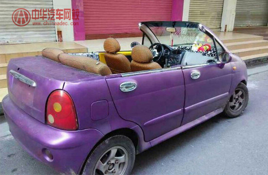 奇瑞QQ切割掉車頂,搖身一變成了一輛跑車,車主還在擋風玻璃上噴涂“雪佛蘭”標志,冒充超級跑車。