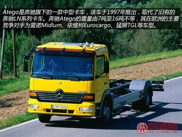 奔馳Atego主要定位在規模中等的物流用車。在奔馳車系里,其地位介于斯賓特、Vario與Actros之間。盡管是中型卡車,但也有牽引車版本。以發 動機來劃分,車型可被分為直列四缸柴油發動機OM 904 LA,以及直列六缸柴油發動機OM 906 LA。前者輸出功率為122至170馬力,后者則為231至326馬力。