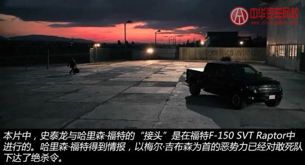 影片中的福特F-150SVT Raptor是四門版的SuperCrew車型,該車生產于2010年–2012年,并且保險杠兩側的預留位置加裝了輔助照明燈具。SVT Raptor作為高性能版本,前臉采用黑色格狀中網,上面是四個大大的黑色字母FORD。非承載式車身、鋼板彈簧、整體橋懸架保證了車輛的剛性和承載能 力,來自FOX的Racing Shox減震器成為SVT Raptor版本的點睛之筆。6.2升V8自然吸氣發動機是專門為SVT Raptor車型而開發的,最大功率417馬力/5500rpm,峰值扭矩588牛·米/4500rpm,與其搭檔的是一臺6擋自動變速箱。