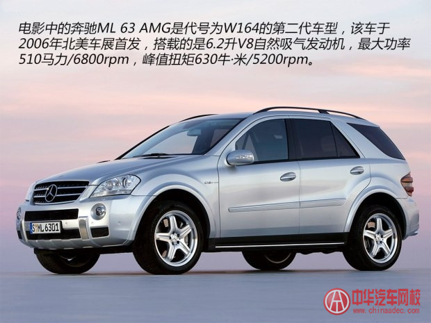 奔馳ML63 AMG的整體外形與普通M級基本相同,但車身上遍布的各種AMG元素還是能夠顯示出該車的與眾不同。ML63 AMG搭載6.2升V8發動機,匹配7G-Tronic7速自動變速箱。官方給出的0至100公里/小時的加速時間為5.0秒。車輛的最高時速被電子限速 在250公里/小時。4MATIC全時四輪驅動系統保證了車輛強悍的越野性能,而基于AIRMATIC空氣懸架的AMG運動型懸架系統則可以提升車輛在運 動中的操控極限。
