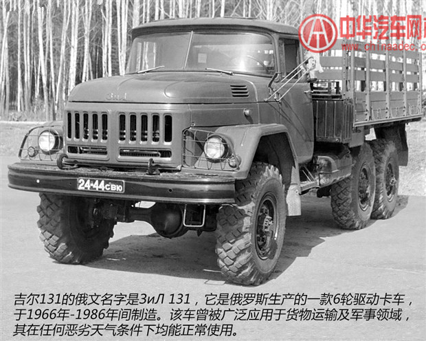 吉爾汽車是前蘇聯的一家卡車生產廠,起初名為斯大林汽車廠,1956年赫魯曉夫下令將斯大林汽車廠改名為利哈喬夫汽車廠,簡稱吉爾(ZIL)。吉爾131 的車身尺寸長寬高分別為6900mm×2500mm×2975mm,軸距為3975mm。動力系統方面,搭載的是一臺6.0升V8化油器發動機,最大功率 為150馬力/3200rpm,峰值扭矩為402牛·米。