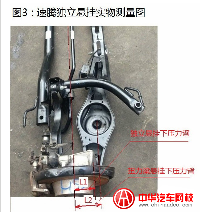 圖3:為獨立懸掛實物測量圖。從實物上測量L1、L2,見下圖。