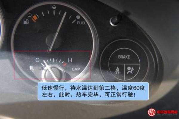 待引擎溫度上升至普通工作溫度(90度左右最佳),(水溫表的溫度提升較發動機溫度的提升有滯后性)水溫表至少達到水溫表的第二格(60度)以上(1到2檔慢行大概需要3到5分鐘時間,按各地區、各車型不同),再恢復正常駕駛。如下圖: