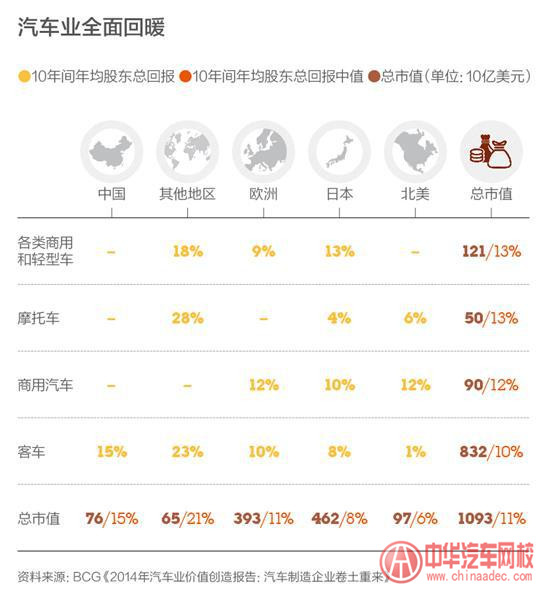 眾所周知,由于受到08年全球金融危機的影響,汽車產業曾和其它行業一樣遭遇低谷,但近兩年卻以驚人的速度恢復過來,并在原有基礎上再次向前跨進了一大步。汽車行業2014年的回暖引發了不少行內乃至行外眾多人士的研究探討,波士頓咨詢公司(BCG)就在近日發表了一篇名為《2014年汽車業價值創造報告:汽車制造企業卷土重來》的報告,該報告回顧了汽車業在2014年的發展,稱其是非常令人驚喜的,同時展望了2015年可能遭遇的挑戰。下面中華汽車網校小編就與大家一起看下該報告的分析。