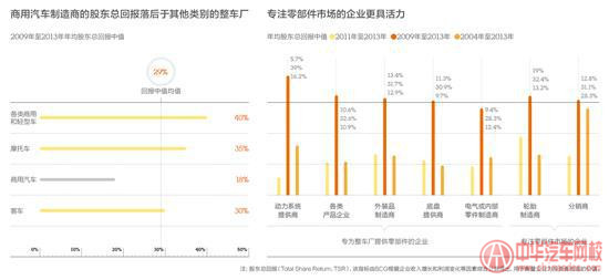 汽車制造商的股東在過去5年中都賺了不少,而汽車零部件企業的股東則賺得更多。零部件企業在2009年到2013年間的年均股東總回報中值達到了33%。但是,只有少量企業能多年一直保持價值增長。