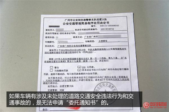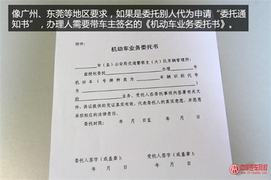 部分地區(像廣州、東莞)要求,如果是委托別人代為申請“委托通知書”,辦理人需要帶車主簽名的《機動車業務委托書》,否則不給代辦。因此在辦理業務前若不清楚可先打電話咨詢一下,以免白跑一趟。