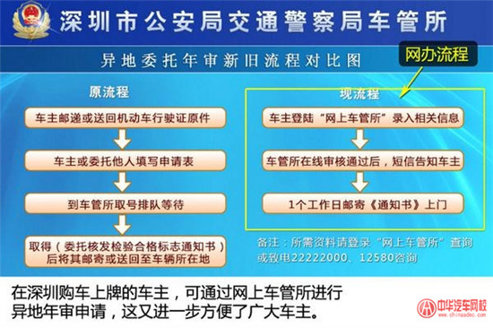 有些地區(例如廣州、深圳)為了進一步方便車主,也可以通過網上直接進行業務辦理,在網上車管所填寫好相關的資料信息之后,車管所會將“委托通知書”直接郵寄給你,這樣就不用跑車管所了。