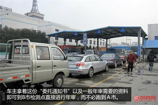要讓車輛具備在B市年審的資格,首先需要向上牌地A市提出申請,A市同意通過后才能在B市進行年審。向A市提出申請后,A市車管所會出具一份《委托核發檢驗合格標志通知書》(下文簡稱“委托通知書”),用以委托B市代為對車輛進行年審;車主拿著這份“委托通知書”以及一般年審需要的資料即可到B市直接進行年審。
