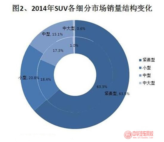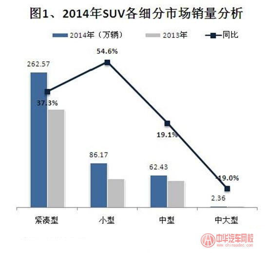根據中華汽車網校整理的資料顯示,2014年,國內SUV市場銷量已突破400萬至413.53萬輛,較2013年同比攀升了37.1%,增幅繼續顯著高于乘用車市場13.0%的整體水平。同時,SUV在乘用車市場的份額提升3.9個百分點,突破兩成至22.4%。