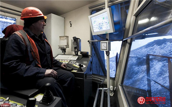 一名礦工正在指揮室監視著屏幕。操縱如此龐大的鋸需要27個人的團結協作才可以。