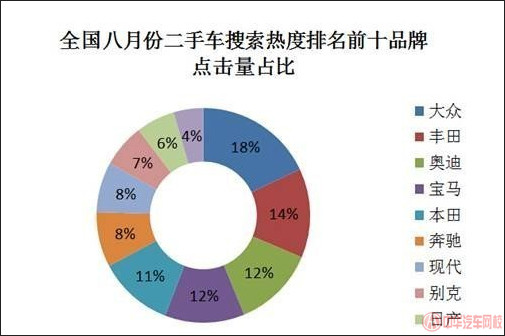 8月,在二手車關注度排名前十品牌中,大眾以18%繼續高居榜首。日系“老大哥”豐田也毫無意