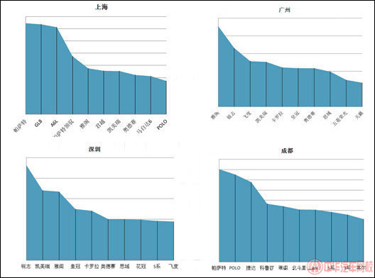 排名一三為均被大眾車型占據,上海除了首位是帕薩特外,其余品牌車型都分布的比較均勻。