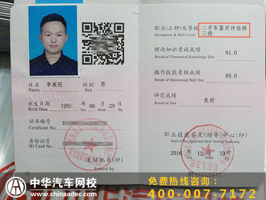 【中華汽車網校 網校新聞】中華汽車網校201607期二手車鑒定評估師證書已經順利下發到我校,此證書由湖南省人力資源和社會保障部職業技能鑒定中心于2016年12月頒發 。