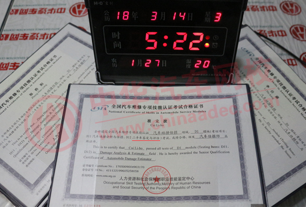 【中華汽車網校 網校新聞】中華汽車網校2018年2月汽車估損師證書已經順利下發到我校,此證書由人力資源和社會保障部職業技能鑒定中心頒發 。