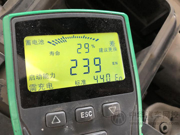 我們先拿出蓄電池檢測儀來檢測一下,發現蓄電池的剩余壽命已不到百分之三十,這里我建議要盡快更換蓄電池。因為盡量避免在外面出行的時候車輛打不著火。