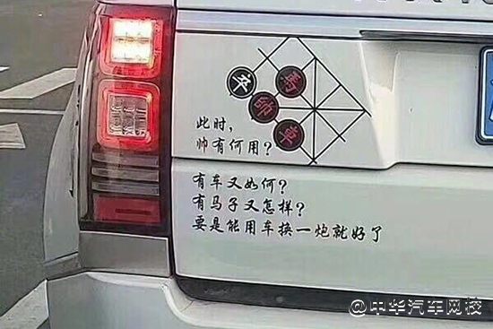此時帥有何用?有車又如何?有馬子又怎樣?要是能用車換一炮就好了...看來創作這個段子的老司機還真是個下棋高手,都喜歡一炮定輸贏!下面還有一些有趣的車貼跟大家分享一下: