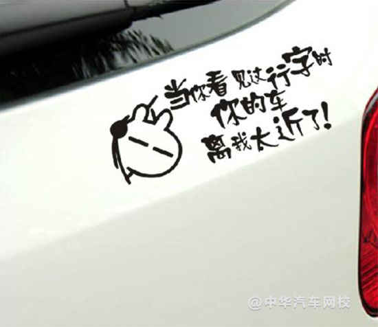 “當你看清這行字的時,你的車離我太近了!”,呀,妹的,都撞上了怎么還是看不清貼的什么鬼玩意兒,擦今天忘了帶眼睛了!