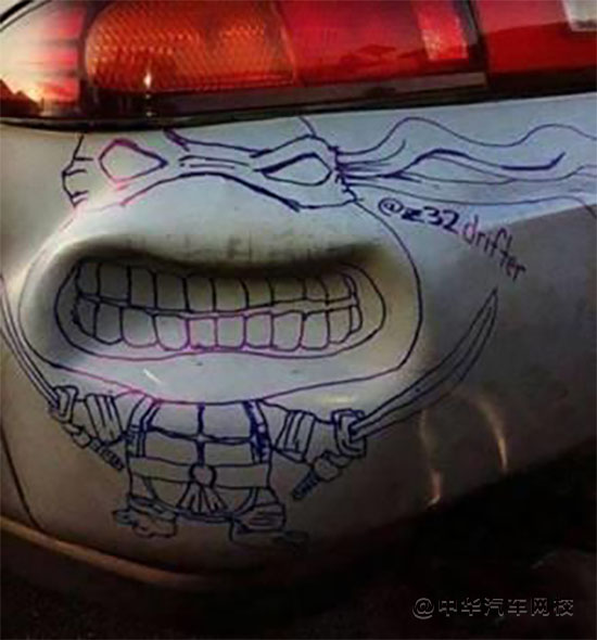 這位段友最有才啦,這車撞得真有創意,干脆四個角都撞一下湊齊四個神龜吧。再把車頭也撞一下,將師傅也一并畫上得了!
