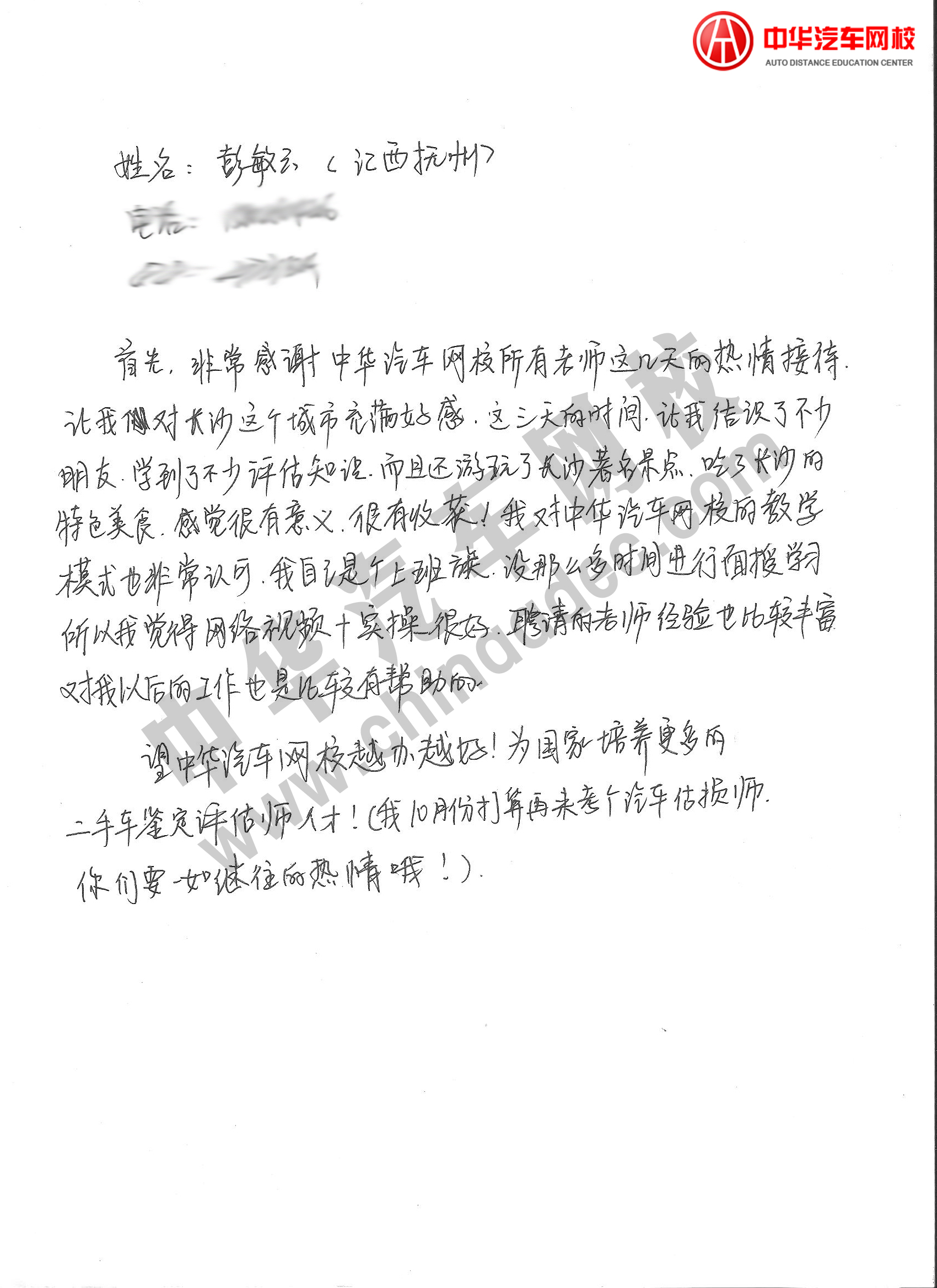 |   | 致中華汽車網校全體老師: 結束了三天的考證培訓,明天要離開長沙回家了,還真有些不舍,這次特意來長沙參加二手車鑒定評估師考試的“旅行”確實讓我終生難忘!很感動中華汽車網校的老師這么親切,熱情。 首先,我覺得網校開辦的“學員拓展”活動非常好!讓我認識了這么多做二手車和汽配方面的前輩,朋友,大家互相留下了聯系方式,呵呵 這次長沙沒白來! 之前網校的網絡視頻教學,我看了十來個,感覺要掌握的知識很多,回家之后我會認真學完,而網校的實踐培訓令我非常意外,老師講的內容很專業使用,講授的方式也清楚易懂。 有時間一定再來考汽車估損師證書!!最后祝中華汽車網校越辦越紅火!