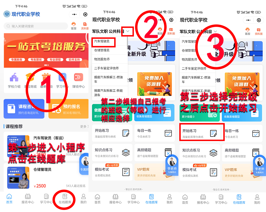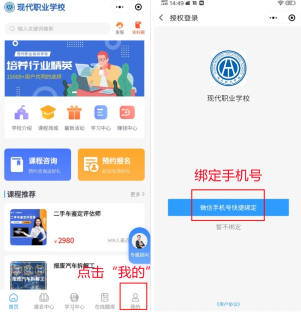 2、微信搜索“現代職業學校”選擇小程序進入學習
